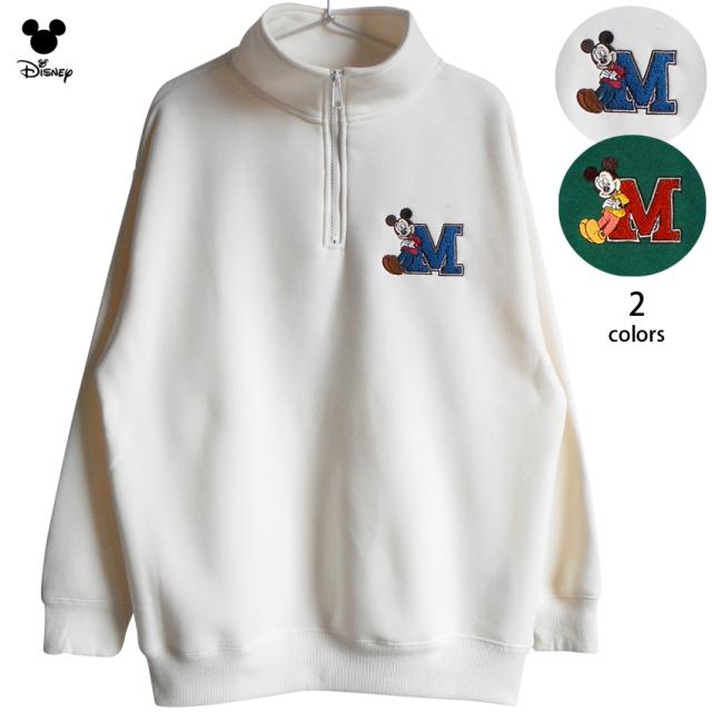 送料無料 ディズニー ミッキー トレーナー ハーフジップ ジップアップ 裏起毛 レディース メンズ 男女兼用 ミッキーマウス スウェット 大きいサイズ disney ボーイッシュ オーバーサイズ かわいい ゆったり TDL 秋冬 ペアルック くすみカラー 緑 白 相良刺? イニシャルM