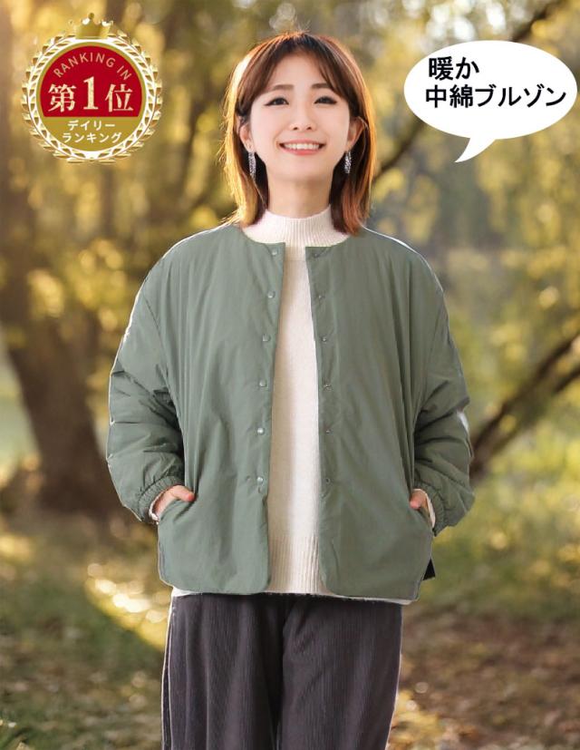 中綿ナイロン ノーカラーブルゾン レディース ジャケット 軽量 あったか 長袖 アウター 体型カバー 前後差デザイン シンプル 大人カジュアル 秋冬