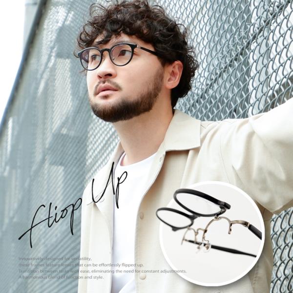 跳ね上げ式 イケおじ 度付きメガネ レンズセット フリップアップ 眼鏡 度入り ブルーライトカット ハネ上げ 近視 老眼 お洒落 メンズ レディース ボストン