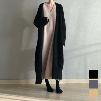ノーカラー ニットコーディガン 無地 前開き ニットガウン 秋冬 アウター 体型カバー おしゃれ ロングカーデ 黒オフィスカジュアル 羽織り 通勤OL カーデゆったり