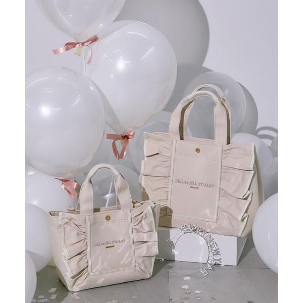 JILL by JILL STUARTのアイコンバッグ「フリルトート」5周年を記念して登場!ボリュームあるワイドフリルと額縁のような配色テープディテールがポイント。従来のフリルバッグとは異なるロゴの書体とサイズ、フリルも大人っぽく仕上げています。ハンドル部分には合皮素材を合わせて、品の良さと実用性も兼ね備えました。取り外しできるショルダー付きの2Way仕様。中は便利なポケット付き。※撮影時照明の関係により、色味が違って見える場合がございます。またパソコン・スマートフォンなどの環境により、若干製品と画像のカラーが異なる場合もございます。予めご了承ください。商品の色味は、商品単品画像をご参照下さい。※商品画像はサンプルのため、色味やサイズ等の仕様に変更がある場合がございますので、予めご了承ください。