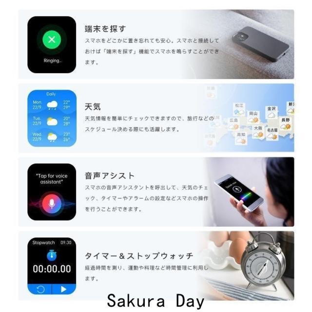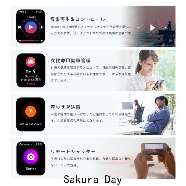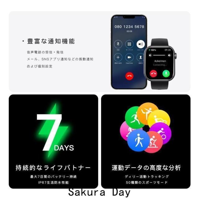 【1.91インチHD大画面&多機能なスマートウォッチ】1.91インチのフルタッチパネル、より大きく高精度な大画面で鮮やかな色合いと読みやすさを実現しました。明るさを自由に調整できます。スマートウォッチには音楽制御、通話機能、メッセージ通知、天気予報、カメラ制御、アラーム、腕上げ点灯、スマホ探し、ストップウォッチなど充実の機能を搭載して、日常生活をより便利にします。オフィス仕事や在宅勤務など必要な座りがち注意、水飲み通知機能付きます。
