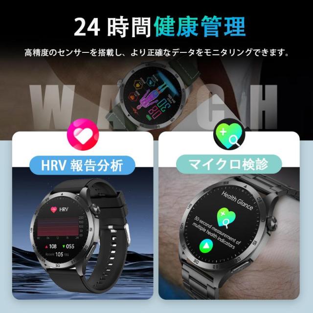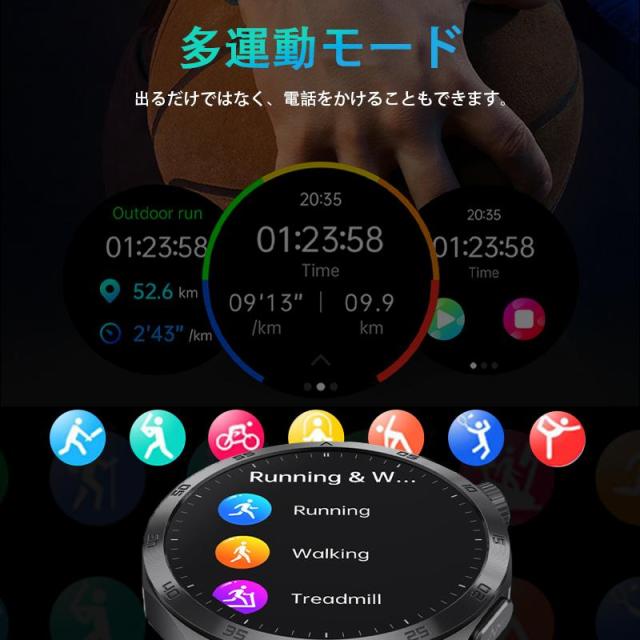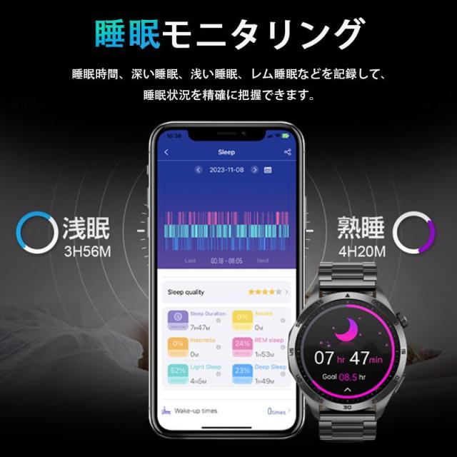 【Bluetooth5.2通話機能&音声アシスタント】スマートフォンとBluetooth接続すれば、電話の受信と応答を行うことができます。大切な電話を逃すことはありません。※※専用アプリと接続するとス マートウォッチで直接に電話をかけることや着信拒否も実現可能。運転中でも運動中でも両手を解放し、より効率的な通話ができます。音声アシスタント機能を搭載しており、スマートウォッチに話しかけるだけで音楽をかけてくれたり、アラームを設定してくれたり、スポーツモードを開始したりするなどの操作を実行できます。