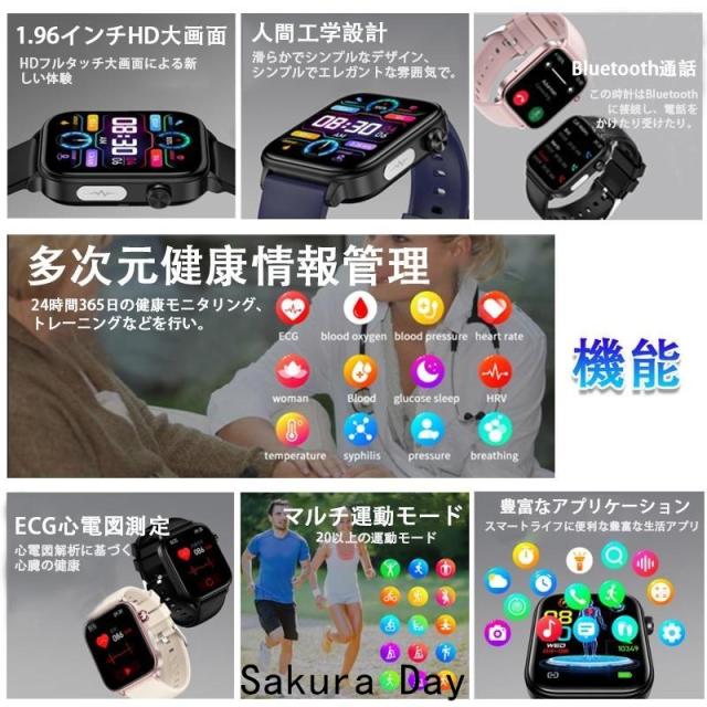 【DIY文字盤&多機能を搭載】- スマートウォッチの文字盤は固定ではありません。多くの文字盤から選べるだけではなく、お好みによって自分が好きな写真を文字盤に設定できます。 240* 280の高解像度と1.96インチのフルタッチスクリーンで、細かい文字でもはっきりと表示されます。他にも音楽コントロール、携帯を探す、腕上げ点灯、タイマー、ストップウォッチ、データ同期、女性生理管理など便利な機能を備えているので、男性でも女性でも使いやすいです!!生活、仕事の効率をさらに上げ、日常生活もより便利にしてくれます。