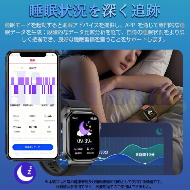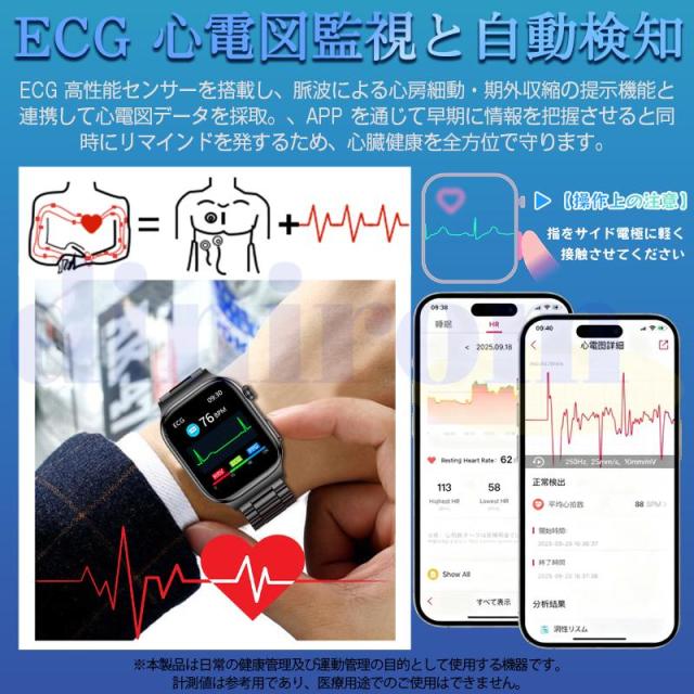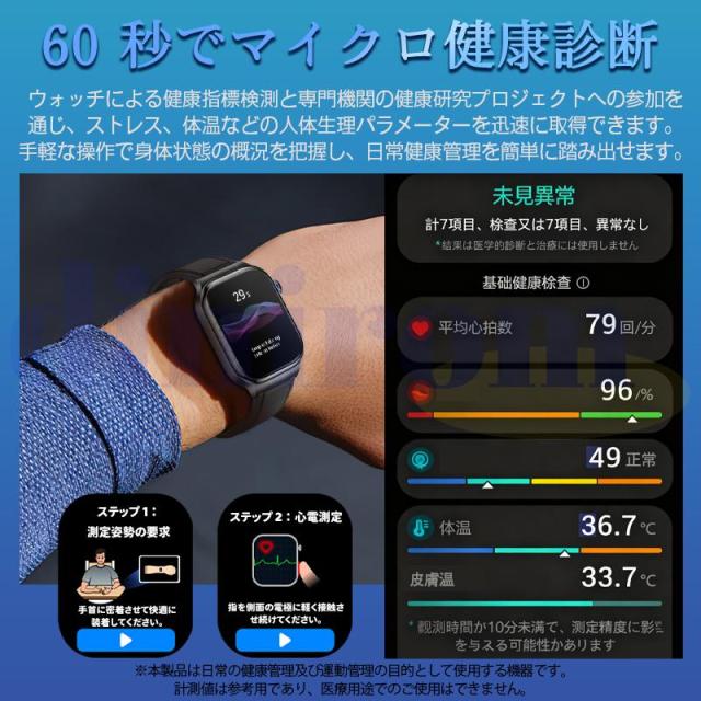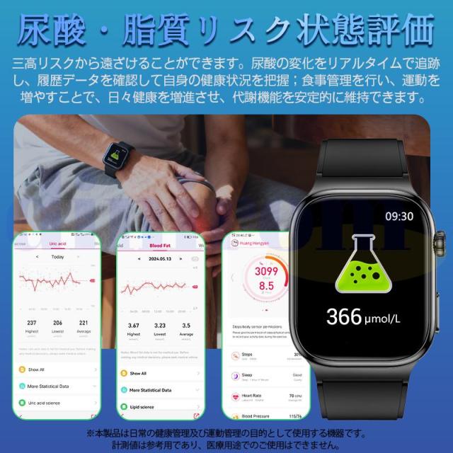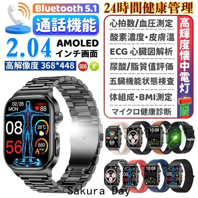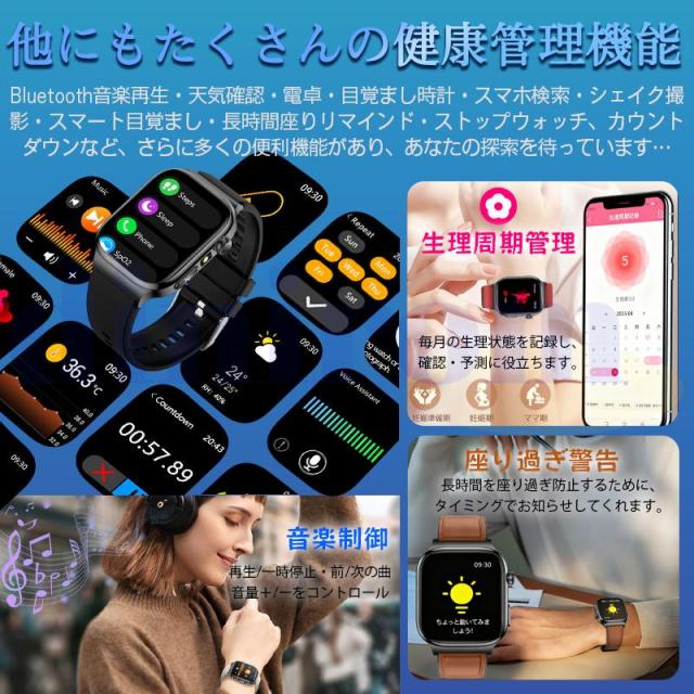 スマートウォッチ 五臓健康管理 血糖値 血圧測定 血中酸素 尿酸 血中脂質 心拍数 BMI ECG心電図 睡眠監視 体温検知 呼吸訓練 女性生理管理 懐中電灯 多運動モード 文字盤自由設定 通話機能付き 着信&メッセージ通知 iphone Android対応 日本語説明書付き