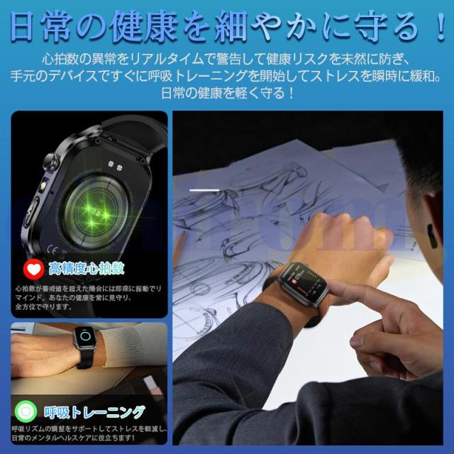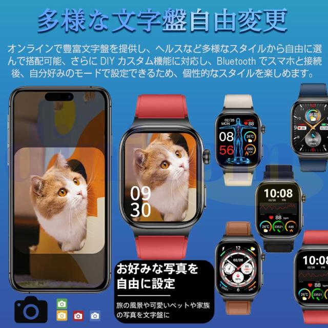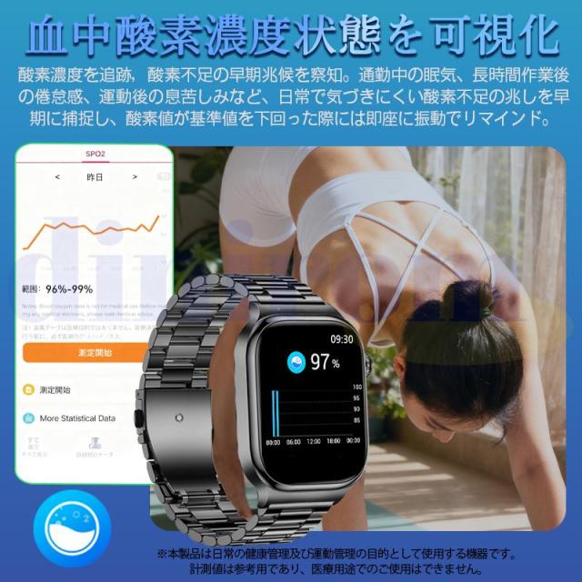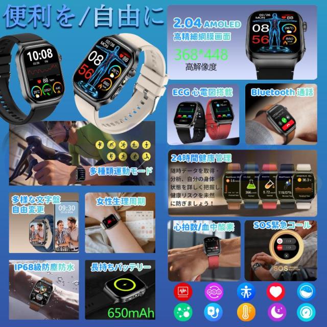 【新登場・2.04インチ大画面】スマートウォッチ従来の製品より外観、中身、性能方面より、完全バージョンアップしました!2.04インチ大画面を採用して、驚くほど鮮明で、美しくリアルな画面を実現しました。画面の明るさ調節も可能で、強い日差し下にも視認性が高く、見やいです。フルタッチパネルを採用し、老眼の方にも見やすい! 高精度な大画面で通知や文字が一目瞭然に表示される。上下左右のスライド操作で機能の切替も簡単です。専用日本語取扱説明書を各機能や操作に記載させていただき、完全なるマニュアルがあるこそ安心できます!特に初心者や年配の方におすすめ!