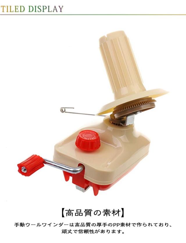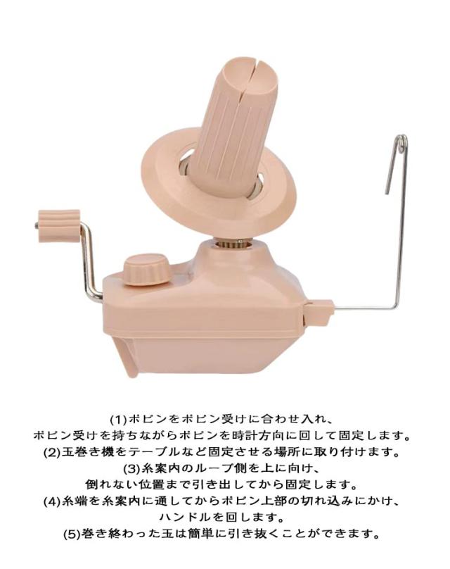 | 毛糸やひもなどきれいに玉巻でできるとっても便利な玉巻き器 玉巻器は糸を玉巻状に巻くときに使用したり、余り糸などをスッキリ整理することができ、かせくり器を使うとスムーズに糸をカセ状にすることができます。二つを一緒に使うことで、かせ糸を簡単に玉巻状にすることができるのでかせ糸の扱いにとても便利な道具です。 くるくると回すだけで、あっという間にカセが玉巻きに。 机や棚に固定してお使いください。 <お勧めポイント> 【高品質の素材】手動ウールワインダーは高品質の厚手のPP素材で作られており、頑丈で信頼性があります。 【機能】家庭用糸ウール巻き取り機。このコンパクトな手動糸巻き機を使用して、緩んだ糸をシンプルかつ実用的に整理できます。 【セットアップと使用が簡単】クランクを回すだけで簡単に使用でき、ウールやその他の多くの紐をボールに巻き付けるのが非常に簡単になり、時間を大幅に節約できます。 【低騒音設計】作業中は静かで騒音が小さいので、家族や近所に迷惑をかける心配がなく、便利で持ち運びも簡単です。 【幅広い用途】クイックワインダーをデスクに設置し、ボタンを強化して固定し、回転ホイールから糸を緩めて、美しいボールを作ります。家庭、工場、家族、スタジオで幅広く使用されています。 ●使用方法 (1)ポピンをポピン受けに合わせ入れ、ポピン受けを持ちながらポピンを時計方向に回して固定します。 (2)玉巻き機をテーブルなど固定させる場所に取り付けます。 (3)糸案内のループ側を上に向け、倒れない位置まで引き出してから固定します。 (4)糸端を糸案内に通してからポピン上部の切れ込みにかけ、ハンドルを回します。 (5)巻き終わった玉は簡単に引き抜くことができます。 | |