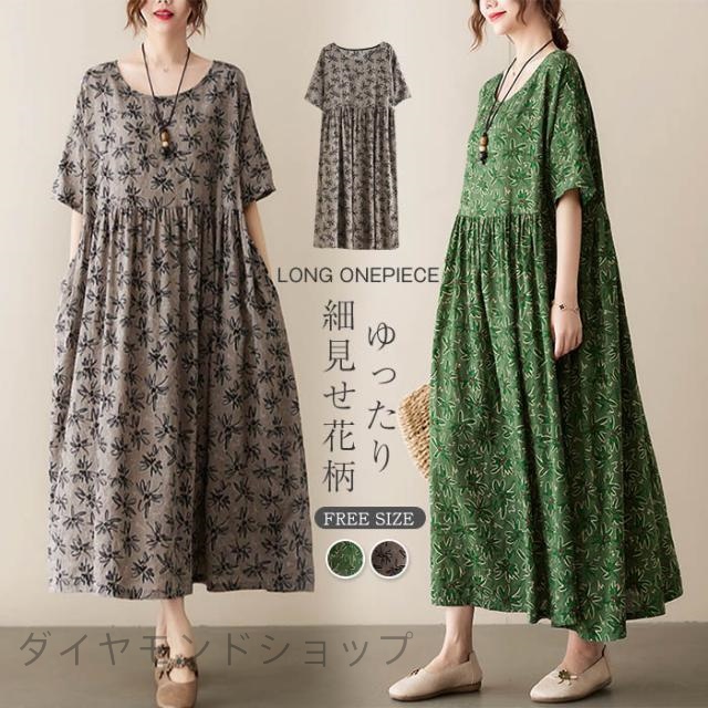 ワンピース レディース 春 きれいめ マキシ丈 マキシワンピ ロングワンピースロングワンピ ワンピ 体型カバー プリント シンプル 半袖 総柄 可愛い フレンチスリーブ Vネック 大きいサイズ 夏 着?せ ふんわり エレガント 送料無料