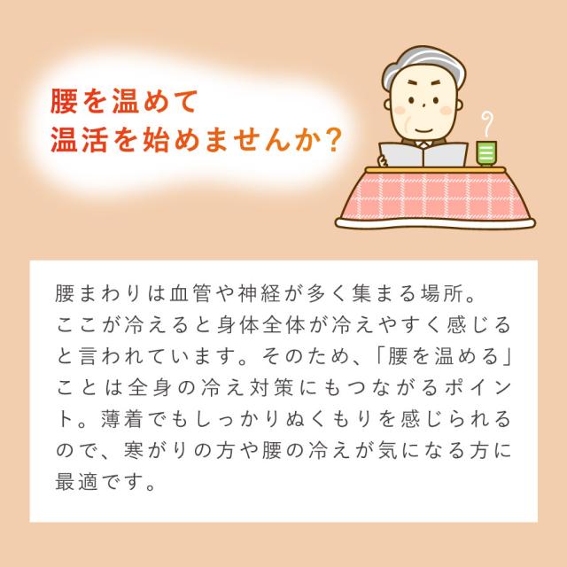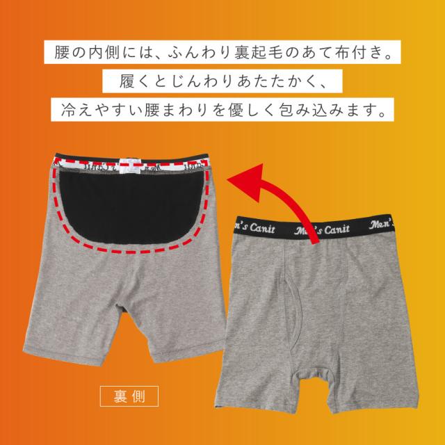 寒い季節の「腰冷え」が気になる方におすすめの、腰部分あったか設計のメンズトランクスです。腰の内側には、ふんわり裏起毛のあて布付き。履くとじんわりあたたかく、冷えやすい腰まわりをやさしく包み込みます。冬の冷え対策として、60代・70代・80代の男性に人気のあったか紳士用下着(トランクス)です。腰まわりは血管や神経が多く集まる場所。ここが冷えると身体全体が冷えやすく感じると言われています。そのため、「腰を温める」ことは全身の冷え対策にもつながるポイント。薄着でもしっかりぬくもりを感じられるので、寒がりの方や腰の冷えが気になる方に最適です。
