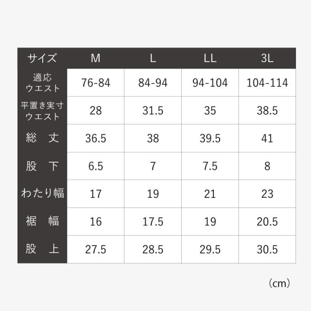 ■サイズ:M/適応ウエスト76-84、総丈36.5、股下6.5、わたり幅17、裾幅16、股上27.5、L/適応ウエスト84-94、総丈38、股下7、わたり幅19、裾幅17.5、股上28.5、LL/適応ウエスト94-104、総丈39.5、股下7.5、わたり幅21、裾幅19、股上29.5、3L/適応ウエスト104-114、総丈41、股下8、わたり幅23、裾幅20.5、股上30.5cm