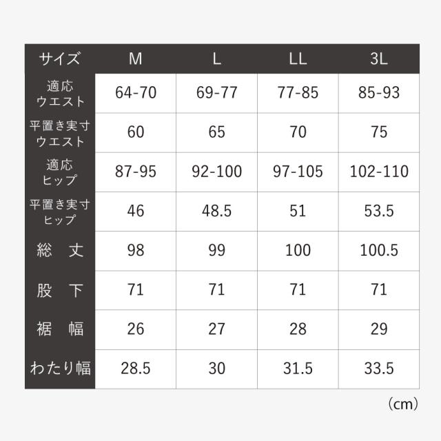 ■サイズ:M/適応ウエスト64-70、適応ヒップ87-95、総丈98、裾幅26、わたり幅28.5、L/適応ウエスト69-77、適応ヒップ92-100、総丈99、裾幅27、わたり幅30、LL/適応ウエスト77-85、適応ヒップ97-105、総丈100、裾幅28、わたり幅31.5、3L/適応ウエスト85-93、適応ヒップ102-110、総丈100.5、裾幅29、わたり幅33.5cm