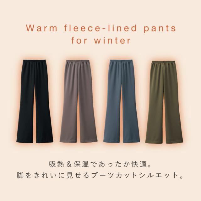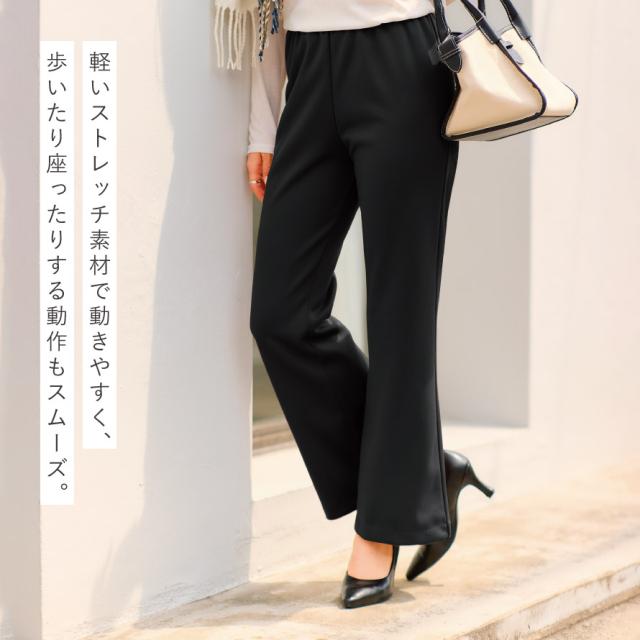 脚をまっすぐきれいに見せるブーツカットシルエットの、あったか裏起毛パンツ(股下71cm)です。ひざ位置を高めに設計し、裾に向かってゆるやかに広がるラインが脚を長く見せ、気になる太もも・ふくらはぎの形をほどよくカバー。体型が変わりやすいシニア世代にも嬉しい、美脚効果のあるきれいめパンツです。