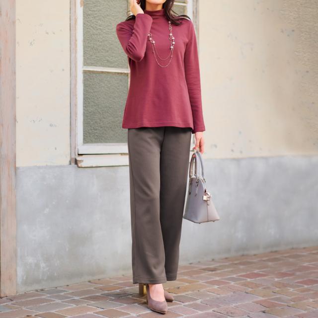 寒い季節のお出かけやお家時間に重宝する、裏起毛のあたたかワイドパンツです。生地には吸熱保温素材「ホットヴェール」を採用し、太陽光や体温から生まれる赤外線を熱へ変えることで、腰まわり・太もも・お腹をじんわり温めてくれます。冬の冷え対策が気になる方に冬用の裏起毛レディースパンツです。裏側はふんわりと柔らかい裏起毛で、履いた瞬間にひやっとしない心地良さが特徴。股上は深めの安心設計で、しゃがんだり座ったりしても背中が出にくく、シニア世代の方からも「安心して履ける」と好評です。ウエストは総ゴム仕様で締め付け感が少なく、ストレッチ素材なので長時間履いていてもラク。体型が変わりやすい年代の方にも快適に着ていただける履き心地です。