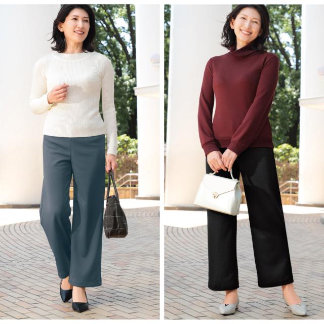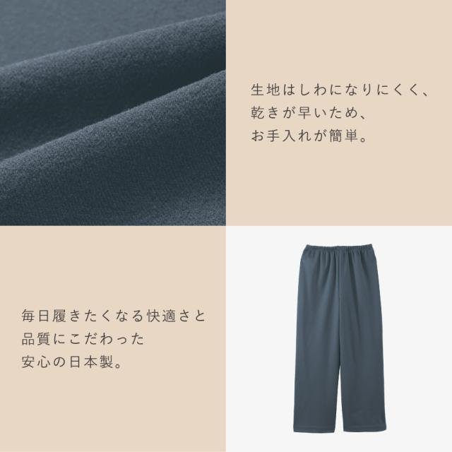 素材はシワになりにくく、洗っても乾きやすいため、お手入れも簡単。旅行や通院、室内着、ちょっとした外出にも使える便利な一本です。見た目はすっきり上品なワイドシルエットで、脚のラインを拾いにくく自然に体型をカバーしてくれるのも嬉しいポイント。ポケットを付けないことで腰まわりが膨らまず、きれいなラインで履いていただけます。