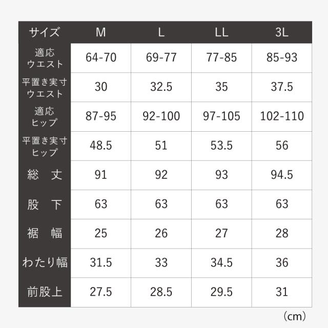 ■サイズ:M/適応ウエスト64-70、適応ヒップ87-95、総丈91、裾幅25、わたり幅31.5、前股上27.5、L/適応ウエスト69-77、適応ヒップ92-100、総丈92、裾幅26、わたり幅33、股上28.5、LL/適応ウエスト77-85、適応ヒップ97-105、総丈93、裾幅27、わたり幅34.5、股上29.5、3L/適応ウエスト85-93、適応ヒップ102-110、総丈94.5、裾幅28、わたり幅36、股上31cm