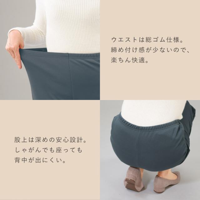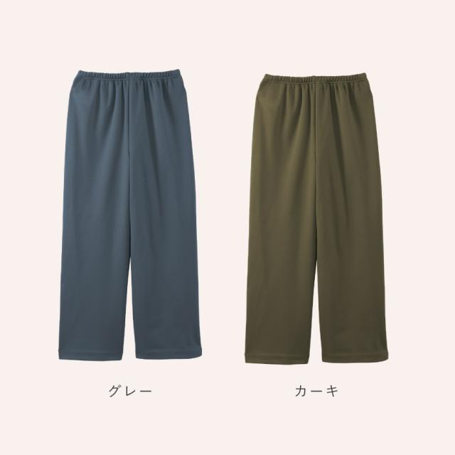 素材はシワになりにくく、洗っても乾きやすいため、お手入れも簡単。旅行や通院、室内着、ちょっとした外出にも使える便利な一本です。見た目はすっきり上品なワイドシルエットで、脚のラインを拾いにくく自然に体型をカバーしてくれるのも嬉しいポイント。ポケットを付けないことで腰まわりが膨らまず、きれいなラインで履いていただけます。