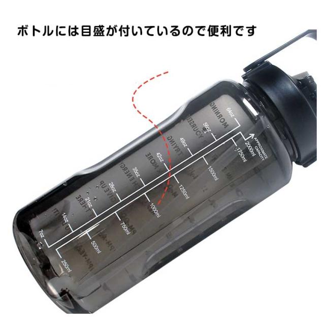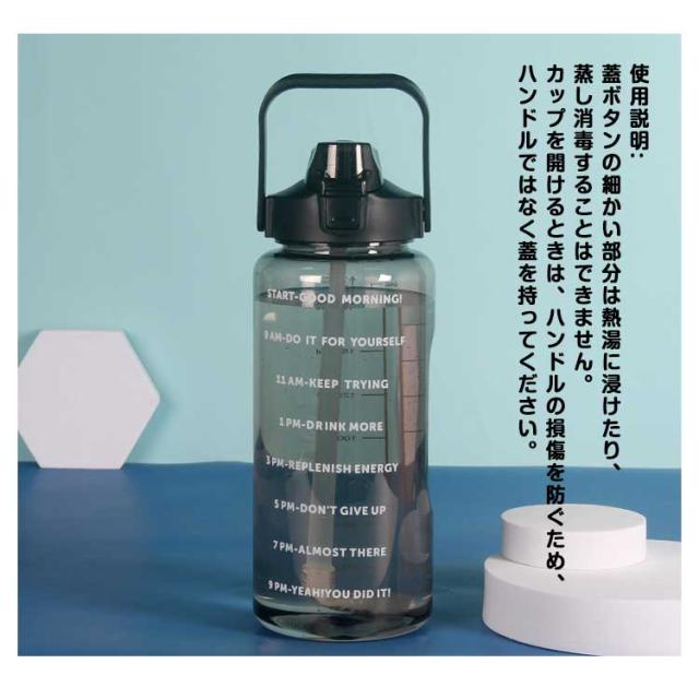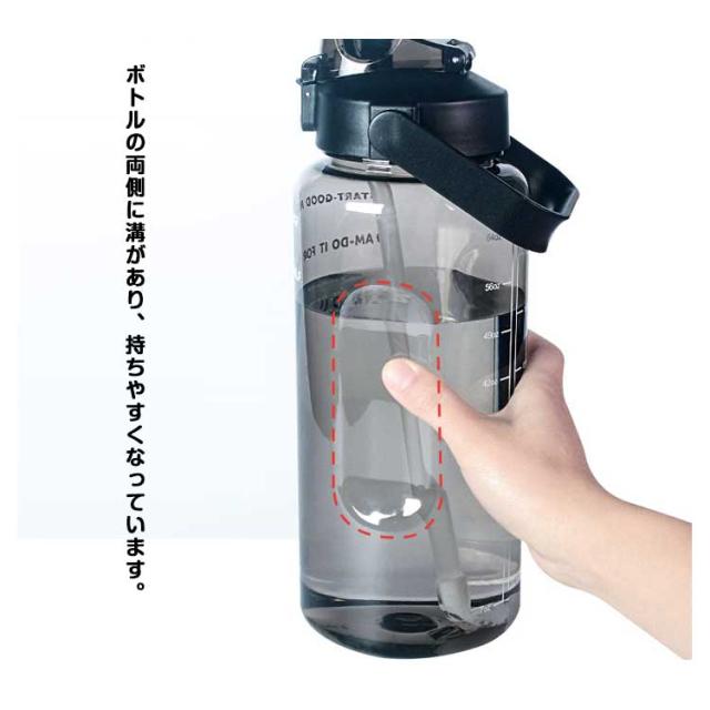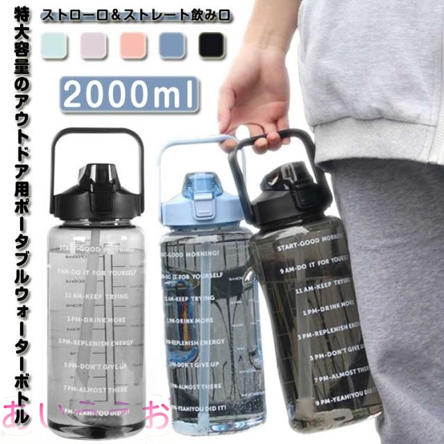 | 特大容量のアウトドア用ポータブルウォーターボトル ストロー口&ストレート飲み口 2000ml 片手でワンタッチポップアップ蓋、飲料水に便利、簡単で省力化 ハンドルのデザイン、持ち運びが簡単 ボトルには目盛が付いているので便利です ボトルの両側に溝があり、持ちやすくなっています。 食品グレードのシリコーンシールリング、、優れたシール性能 使用説明: 蓋ボタンの細かい部分は熱湯に浸けたり、蒸し消毒することはできません。 カップを開けるときは、ハンドルの損傷を防ぐため、ハンドルではなく蓋を持ってください。 | |