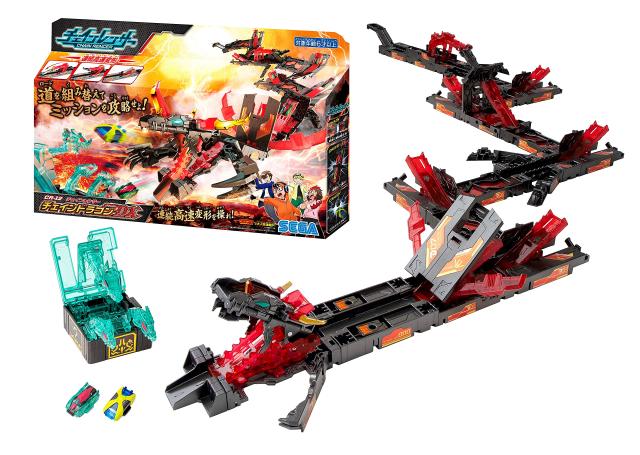 チェインレンサー(連続高速変形する道)を組み替えて、チェインカーを走行させよう!人気のドラゴンをテーマに、圧倒的なボリュームで様々な遊びのバリエーションが楽しめるセットです。電池を使わずに、次々と変形するコースに大興奮! 対象年齢:6歳以上