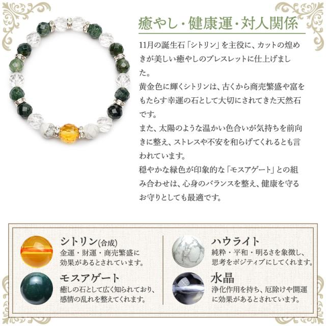 | 材質(±0.5mm) | 1-A 癒やし トライアングルカット 合成シトリン:10mm 64面カット モスアゲート:8mm 64面カット ハウライト:8mm 64面カット 水晶:8mm 銀ロンデル:2mm 1-B 恋愛 トライアングルカット 合成シトリン:10mm 64面カット ローズクォーツ:8mm 64面カット アメジスト:8mm 64面カット 水晶:8mm 銀ロンデル:2mm 1-C 金運 トライアングルカット 合成シトリン:10mm 64面カット オニキス:8mm 64面カット イエロータイガーアイ:8mm 64面カット 水晶:8mm 金ロンデル:2mm |