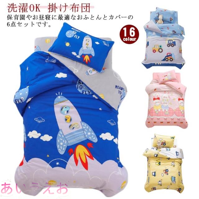 | サイズについての説明 | 【6点セット内容】掛けふとんカバー、敷きふとんカバー、枕カバー、掛けふとん、敷きふとん、枕 【サイズ】 【掛けふとん】120*150cm 【敷きふとん】60*135cm 【枕】30*50cm ※上記サイズは平置き実寸になります。 サイズ表の実寸法は商品によって1-3cm程度の誤差がある場合がございます。 |