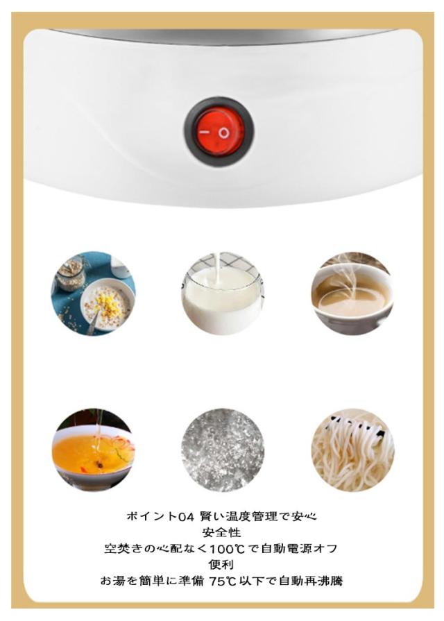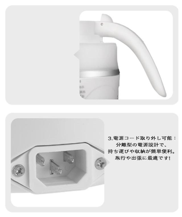 | 0.6L 600W 折りたたみ式 電気ケトル こんなお悩みございませんか 宿泊先の電気ケトルが汚れている・・・ 衛生面が心配で使いたくない・・・ ホテルや宿泊先にポットがない・・・ カフェや自販機のお湯に頼るのが不便・・・ キャンプやアウトドアでお湯が沸かせない・・・ 旅行・出張の必需品!愛用される6つの理由// 折りたたみ式 ワンボタン 600W急速加熱 温度ヒューズ 自動で再加熱 耐高温シリコン ポイント01 600Wの高効率加熱 時間を節約! わずか6-10minで沸騰完了。 ポイント02 折り畳み式でコンパクト 約1/2に縮小 バッグやスーツケースにすっきり収納可能。 ポイント03 600mlのちょうどいい容量 1~2人に最適な容量 少人数での使用にぴったり!旅行や出張、日常使いにも便利です。 ポイント04 賢い温度管理で安心 安全性 空焚きの心配なく100℃で自動電源オフ 便利 お湯を簡単に準備 75℃以下で自動再沸騰 ポイント05 簡単に折り畳める設計 旅行や出張にピッタリな折り畳みケトル! ポイント06 使いやすいデザイン 1.握りやすい持ち手:手のひらにフィットする滑らかな曲線で、握りやすく疲れにくいデザイン。 2.流線型の注ぎ口:水の流れがスムーズで、 こぼれにくい設計。さらにフィルター付きで異物混入を防止。 3.電源コード取り外し可能:分離型の電源設計で、持ち運びや収納が簡単便利。 旅行や出張に最適です! | |