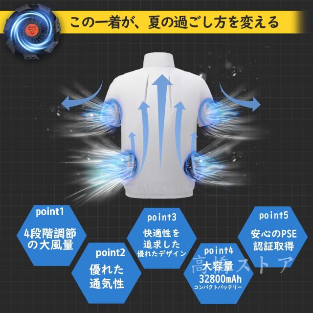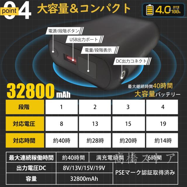 小型の高性能ファンが2つ搭載。新モデルはパワフルで静音、効率よく空気を循環させて体温を下げます。 ●【大容量バッテリー&長時間稼動】 32580mAhの大容量バッテリー搭載、最大40時間稼動可能で長時間の作業でも安心。
