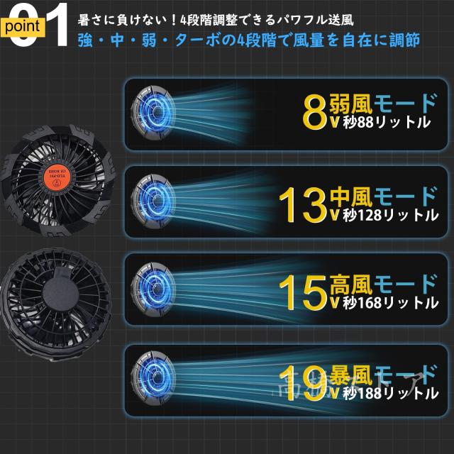 1、服+ファンだけ(バッテリーなし) 2、セットA(服+ファン+15800mAhバッテリー) 3、セットB(服+ファン+32580mAhバッテリー) ●【9枚羽強力ファン&4段階風量】