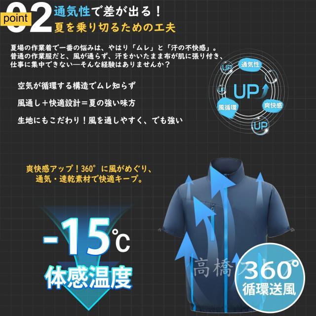 外気を取り入れ汗の蒸発を促進し、効率よく体温を下げます。汗臭やあせもを防ぎ、疲労軽減や作業効率向上にも効果的。