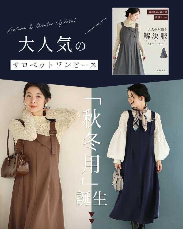 新作12月9日 大人のお悩み 解決服 万能サロペットワンピース 秋冬Ver. cawaii fbr00067 SM/LXL対応 ショート/ロング丈展開 着回し 体型カバー ブラウン ネイビー オシャレ 個性的 大人可愛い エレガント 上品 秋服 冬服 レディース ファッション ミセス 30代 40代 50代
