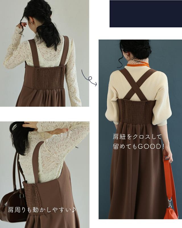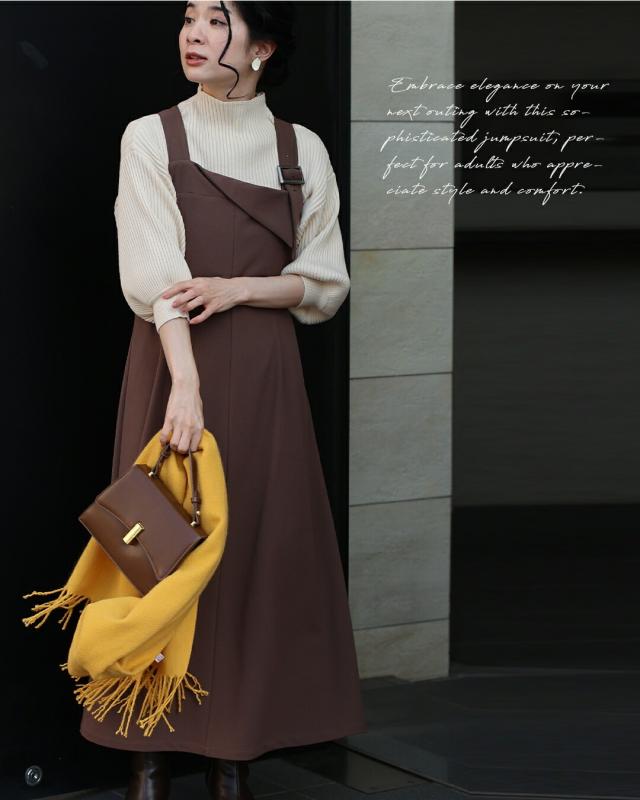 fbr00067 新作 新着 再入荷 CAWAII FRENCHPAVE フレンチパヴェ エレガント ベーシック カジュアル 可愛い かわいい カワイイ おしゃれ オシャレ お洒落 個性 個性的 定番 ベーシック 大人かわいい 大人可愛い 上品 女性らしい デザイン スタンダード ナチュラル きれいめ キレイめ シンプル フェミニン レディース レディースファッション 大人 ママ ミセス 30代 40代 50代 60代 大人のお悩み 解決服 万能サロペットワンピース 秋冬Ver. オールインワン S M L XL 小さめ 小さいサイズ 低身長 標準 痩せ ほっそり 小柄 細身 春 秋 冬 秋服 秋物 冬服 冬物 着回し ブラウン ネイビー サイズ展開 ショート ロング 無地 普段着 日常使い デイリー おでかけ サイドファスナー シャーリング スタイリッシュ