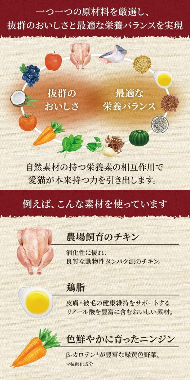 | 原材料 | チキン(肉)、チキンミール、エンドウマメ*2*3、大麦*3、玄米*4、サーモン(すり身)*5、エンドウタンパク、ビートパルプ*3、タンパク加水分解物、鶏脂*1*6、亜麻仁*3*7、チアシード*3*7*8、ココナッツ*9、トマト*8、乾燥卵、パンプキン*8、ケール*8、ホウレン草*8*10、ブルーベリー*8、リンゴ*8、ニンジン*8、ビタミン類(A、B1、B2、B6、B12、C、D3、E、コリン、ナイアシン、パントテン酸、ビオチン、葉酸)、ミネラル類(カリウム、カルシウム、クロライド、セレン、ナトリウム、マンガン、ヨウ素、亜鉛、鉄、銅)、アミノ酸類(タウリン)、酸化防止剤(ミックストコフェロール、ローズマリー抽出物、クエン酸) *1ミックストコフェロールで保存*2ビタミンB1含、*3食物繊維含、*4鉄分、亜鉛、ビタミンE含、*5DHA、EPA含、*6リノール酸含、*7α?リノレン酸、*8抗酸化成分含、*9中鎖脂肪酸、カリウム含、*10鉄分含 |
