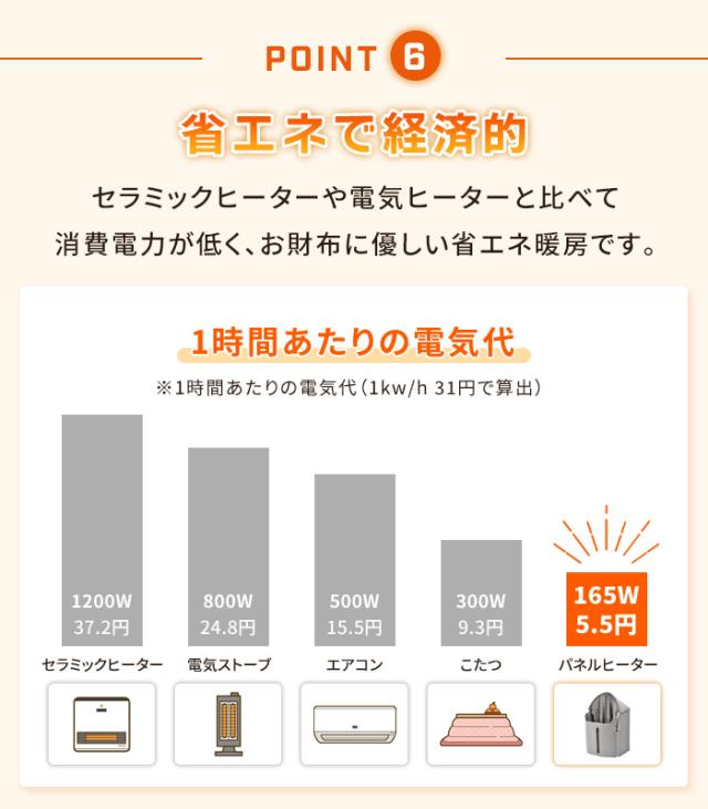 エアコンのように部屋全体を温める必要がないため、消費電力も比較的低く、1時間当たりの電気代は5円前後と経済的。