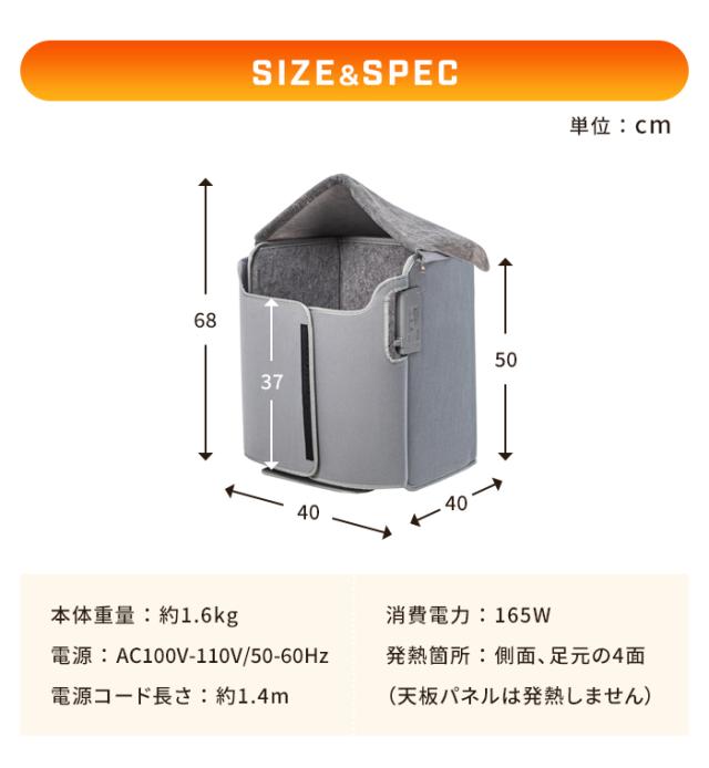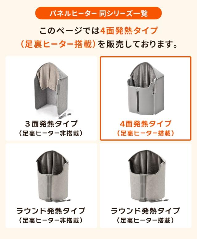 | ・発熱箇所:側面パネル3面・足裏ヒーター1面 (天面・前面パネルは発熱しません) |