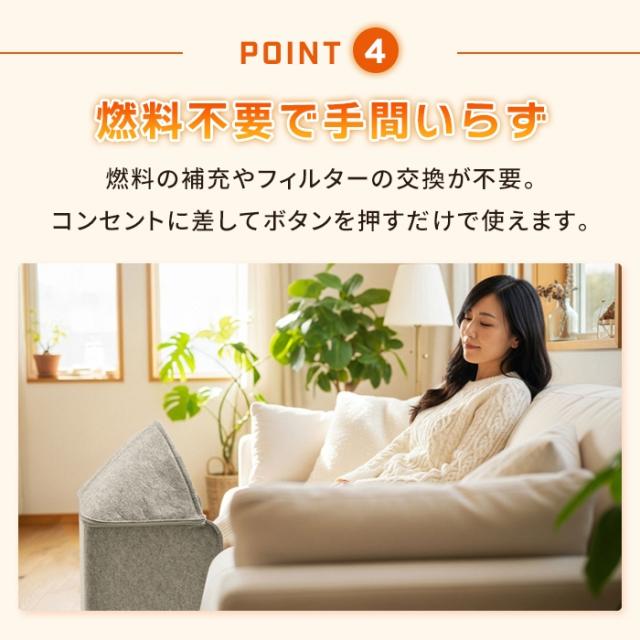 | 包み込むような暖房で、暖かさを逃さず閉じ込める、足元の冷え対策にぴったりな足裏ヒーター付きパネルヒーター。 熱源となるパネルと足裏ヒーターが遠赤外線を利用した輻射熱で、まるで足湯に浸かっているかのように足元をじんわりと温めます。 さらに着脱式の天面パネをル装着することでフタの役割を果たし温かさを逃がしにくくなり、まるで自分だけの「簡易こたつ」のように効率よく温めることができ、高い暖房効果を実現します。 使用時の動作音が静かなので、深夜や職場でも周囲にを気にせず快適に使用できます。 エアコンのように部屋全体を温める必要がないため、消費電力も比較的低く、1時間当たりの電気代は5円前後と経済的。 コンパクトに折りたためるので、オフシーズンも邪魔になりません。 |