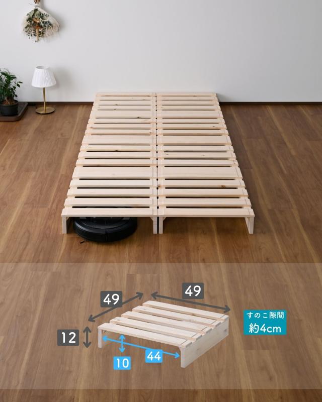 | 商品説明 | ●完成品でお届け、組み立て不要 ●低いベッドをお探しの方へおすすめなロータイプベッドフレーム ●パレットのように組み合わせて使う、木製すのこのローベッド ●バラバラにしても並べるだけなので、模様替えや引越しに嬉しい完成品 ●従来品に加え、ロボット掃除機対応の高さ12cmタイプが仲間入り ●素材はパイン材、燻蒸処理をして、死に節を除外する選定基準で安全に配慮した設計(無塗装) ※研磨や面取り処理は行っていますが、ザラつきが残る場合があります ●角度は丸みをつけたやさしいデザイン ●床への接地面はすべて脚にフェルト貼り付け ●8枚でおよそシングルサイズ、12枚でダブルサイズ、1枚ずつは付属のバンドでしっかり連結することも可能 ●連結用バンド(面テープ) 付属 ●静止耐荷重は、 8枚をシングルベッド利用時で200kg 12枚をダブルベッド利用時で300kg (耐荷重は、保証値ではございません。) ※本製品は最大荷重試験の7000N(約700Kg)をクリアした商品です。当社では安全を考慮し、本商品はシングルベッド利用時は耐荷重200Kg、ダブルベッド利用時は耐荷重300kgに設定しております。 ●しっかりしたつくりなので、組み合わせを変えてベンチのように使うことも可能 ※2023年12月 1日より耐荷重表記について見直しを行いました。 ●パレット1枚あたりサイズ: 幅49 奥行49 高さ12cm、重量2kg ●すのこ板が5枚、すのこ板厚み1.5cm、すのこ隙間約4cm 【シングル】は高さ12cm×8枚で、全体幅98cm 【ダブル】は高さ12cm×12枚で、全体幅147cm |
