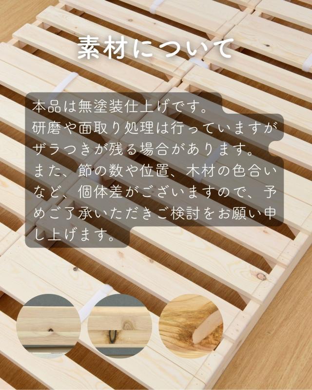 | 商品説明 | ●完成品でお届け、組み立て不要 ●低いベッドをお探しの方へおすすめなロータイプベッドフレーム ●パレットのように組み合わせて使う、木製すのこのローベッド ●バラバラにしても並べるだけなので、模様替えや引越しに嬉しい完成品 ●従来品に加え、ロボット掃除機対応の高さ12cmタイプが仲間入り ●素材はパイン材、燻蒸処理をして、死に節を除外する選定基準で安全に配慮した設計(無塗装) ※研磨や面取り処理は行っていますが、ザラつきが残る場合があります ●角度は丸みをつけたやさしいデザイン ●床への接地面はすべて脚にフェルト貼り付け ●8枚でおよそシングルサイズ、12枚でダブルサイズ、1枚ずつは付属のバンドでしっかり連結することも可能 ●連結用バンド(面テープ) 付属 ●静止耐荷重は、 8枚をシングルベッド利用時で200kg 12枚をダブルベッド利用時で300kg (耐荷重は、保証値ではございません。) ※本製品は最大荷重試験の7000N(約700Kg)をクリアした商品です。当社では安全を考慮し、本商品はシングルベッド利用時は耐荷重200Kg、ダブルベッド利用時は耐荷重300kgに設定しております。 ●しっかりしたつくりなので、組み合わせを変えてベンチのように使うことも可能 ※2023年12月 1日より耐荷重表記について見直しを行いました。 ●パレット1枚あたりサイズ: 幅49 奥行49 高さ12cm、重量2kg ●すのこ板が5枚、すのこ板厚み1.5cm、すのこ隙間約4cm 【シングル】は高さ12cm×8枚で、全体幅98cm 【ダブル】は高さ12cm×12枚で、全体幅147cm |