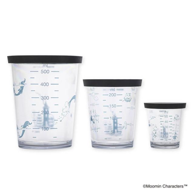 どんな文字でも読みやすく、どんな調味料でも量りやすい目盛カラーのフタ付き計量カップ。カップにムーミン谷の仲間たちをプリント。中に調味料を入れると浮かんでいるように見えるデザイン。