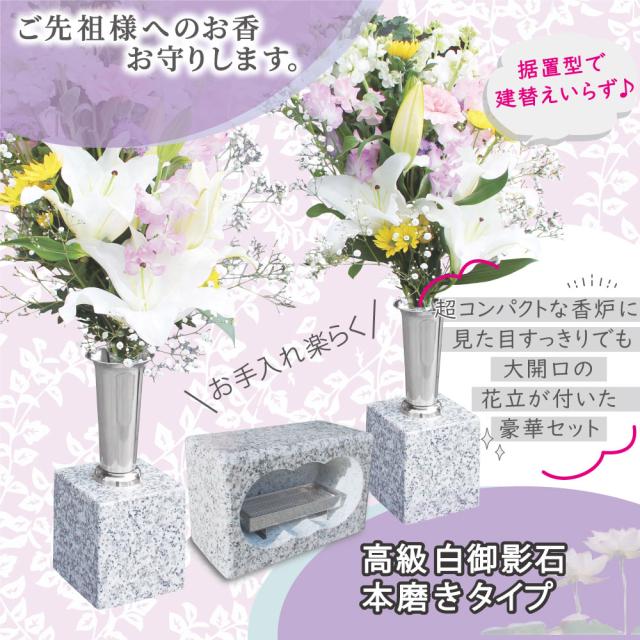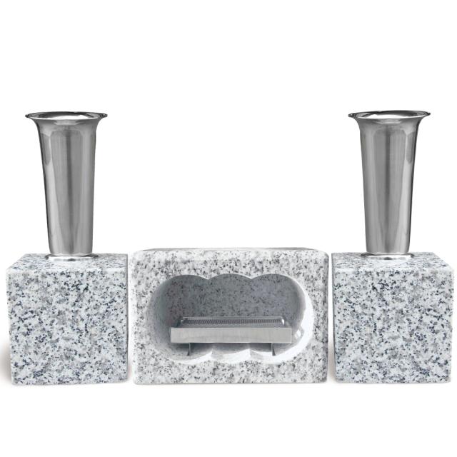 【お墓用】花立M ミニ香炉セット お墓用 高級白御影石の花立とステンレス製 花筒1対(2本)+ミニ香炉(線香皿付き)【工事不要】置くだけで簡単設置 B0FXG8HMMG
