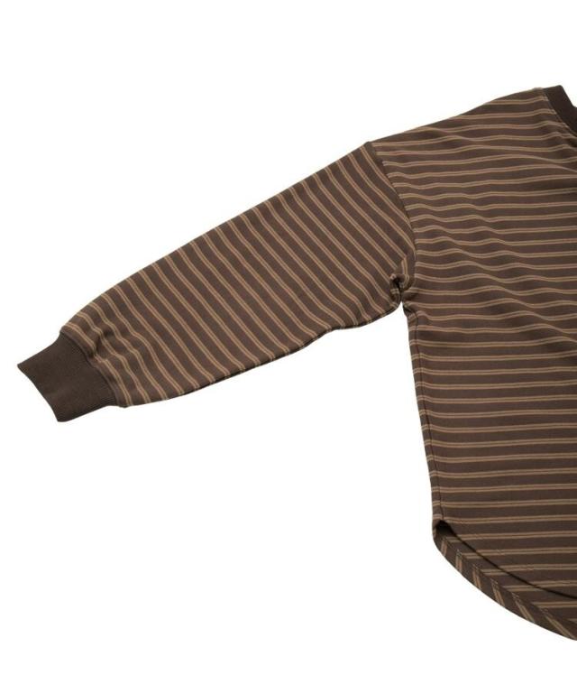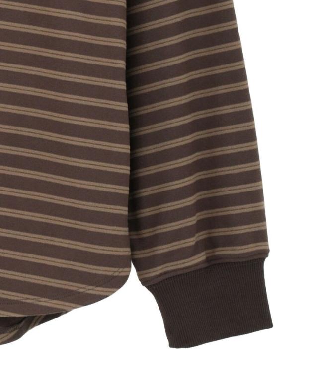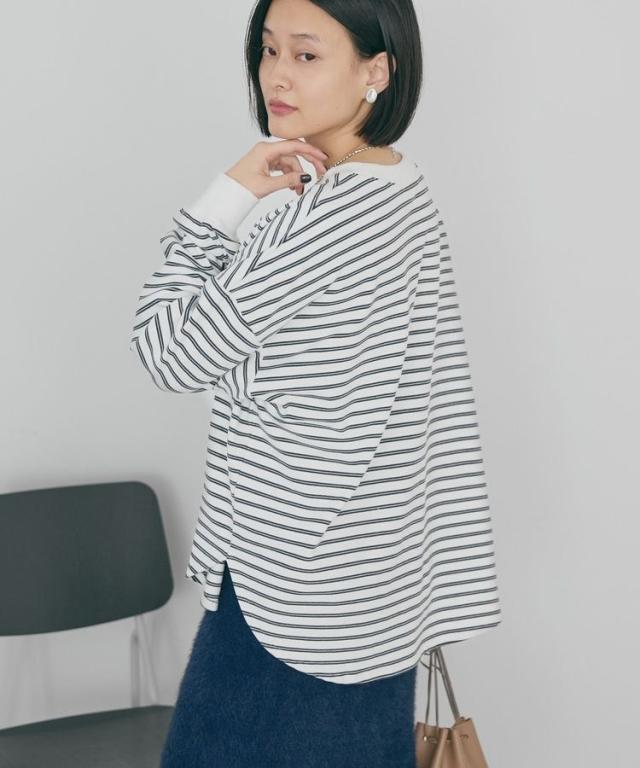 ふんわりと起毛した素材で仕立てた温かみのあるプルオーバー。カジュアルになりすぎない細めボーダーが着こなしにスタイリッシュなアクセントを加えます。優しい肌触りで快適な着心地なのも魅力的。やや前後差のあるヘムラインが気になる部分をカバーして、スタイルアップ効果も期待出来るおすすめのアイテムです。透け感[なし]