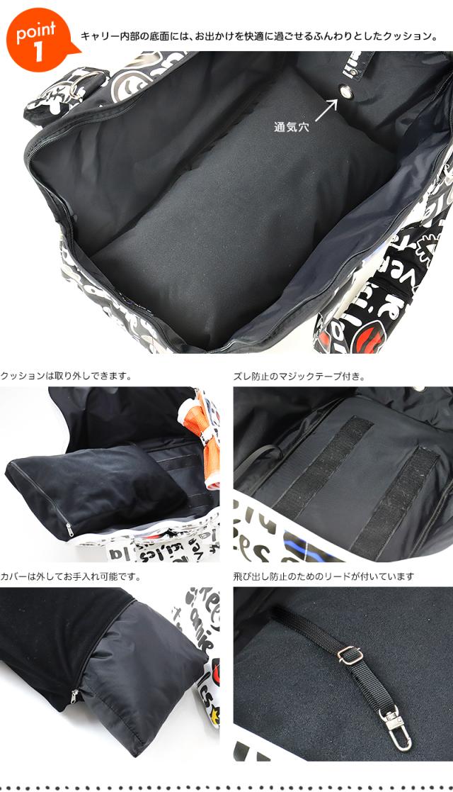 | SPEC | 重 さ:約970g / ショルダーベルト込み:約1120g 耐重量:6kg 素 材:ナイロン(本体)、ポリエステル(ベルト) 付属:ソフトクッション、とび出し防止リード 本体サイズ:約W45×H31×D24cm メッシュ窓の高さ:15cm 持ち手高さ:26cm 持ち手太さ:6cm 収納:オープンポケット×2(外側) |