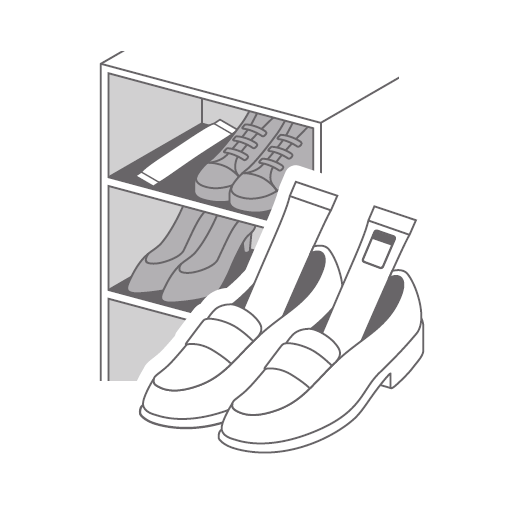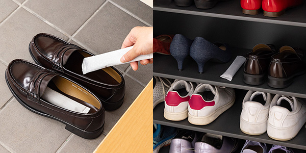 活性炭と乾燥剤の組み合わせでくつ・くつ箱の気になるニオイと湿気を取り除きます。