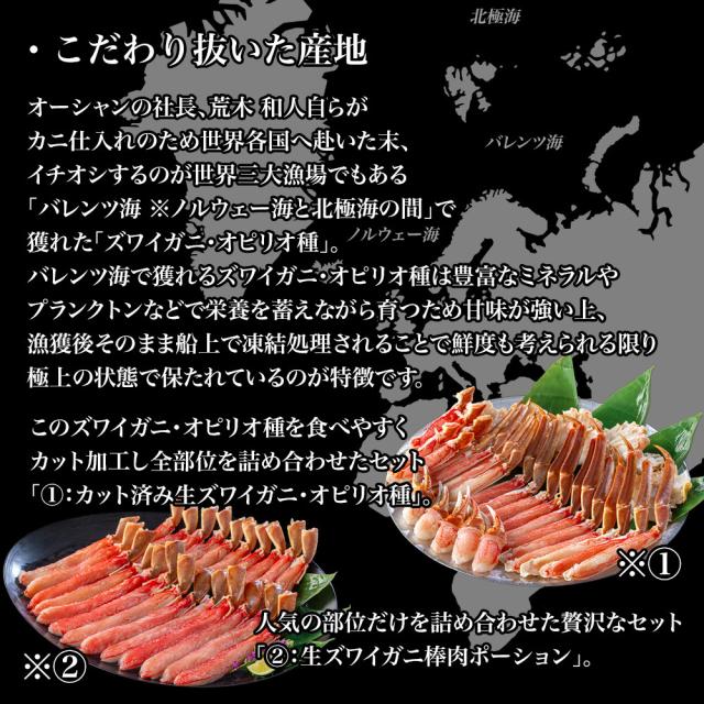 下記商品説明にて記載をしております、2.生ズワイガニ棒肉ポーションタイプについては価格が異なりますため、別ページにて販売を行っております。(送料無料:税込14,800円)