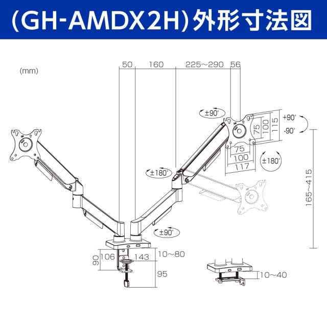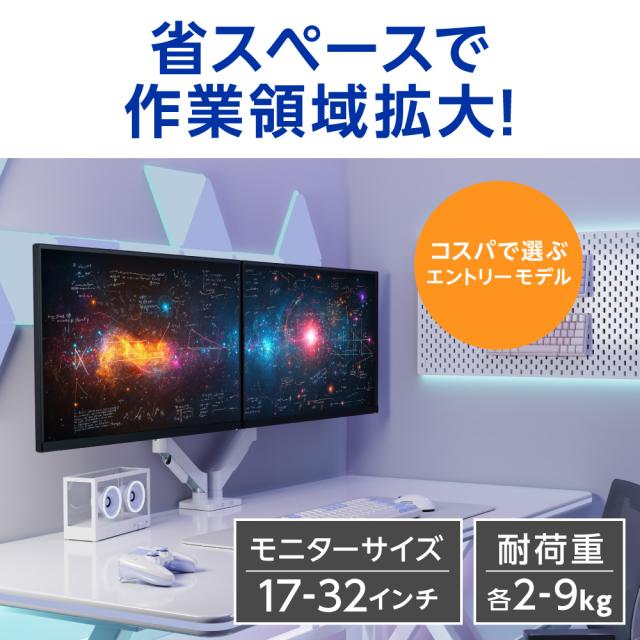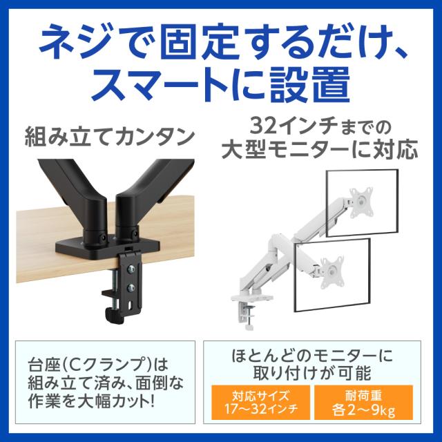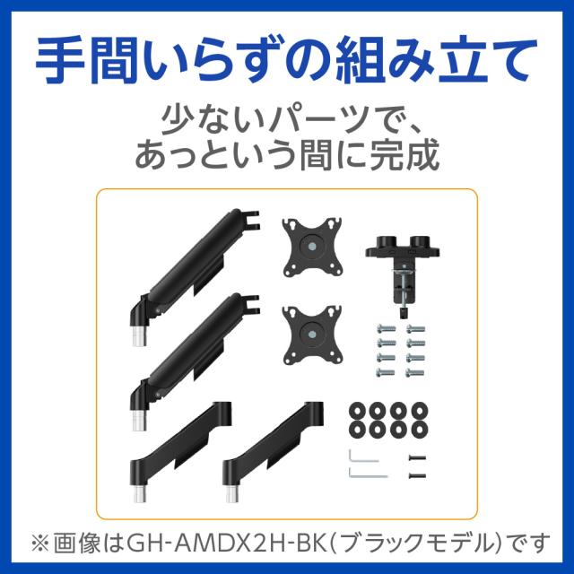 モニターアーム 2画面 最大32インチ 各耐荷重9kg メカニカルスプリング 上下左右移動 画面回転 セットアップ簡単 3年保証 GH-AMDX2H グリーンハウス