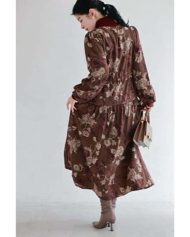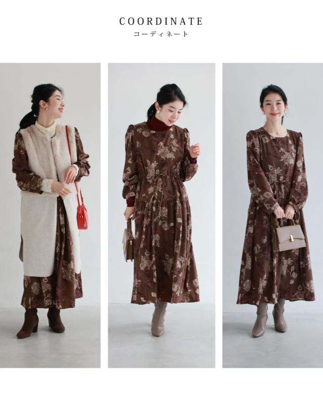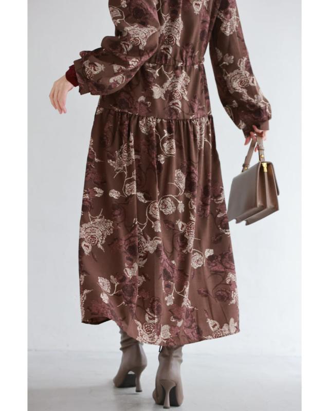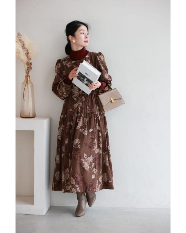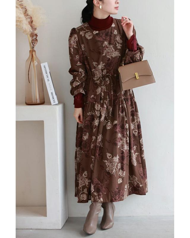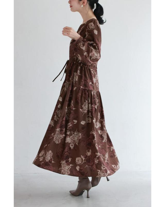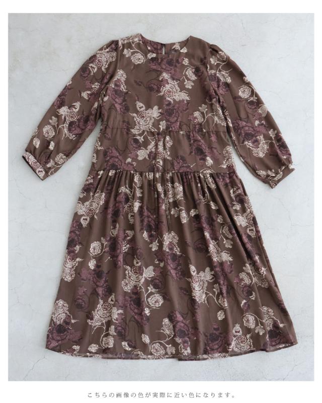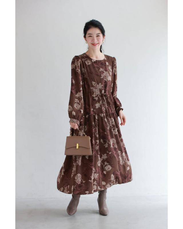 wkj00306 新作 新着 再入荷 CAWAII FRENCHPAVE フレンチパヴェ エレガント ベーシック カジュアル 可愛い かわいい カワイイ おしゃれ オシャレ お洒落 個性 個性的 定番 ベーシック 大人かわいい 大人可愛い 上品 女性らしい デザイン スタンダード ナチュラル きれいめ キレイめ シンプル フェミニン レディース レディースファッション 大人 ママ ミセス 30代 40代 50代 60代 優雅なバラ描く ショコラカラー ミディアム ワンピース 長袖 S M L XL ワンサイズ フリー 小さめ 小さい 低身長 痩せ ほっそり 小柄 細身 標準サイズ 大きめシルエット 大きい ビッグシルエット ゆったり F サイズ自由 春 秋 冬 秋服 秋物 冬服 冬物 体型カバー ブラウン 茶 柄 総柄 花 フラワー 普段着 日常使い デイリー おでかけ 旅行 デート 大人女子 プリント ティアード