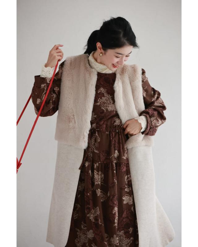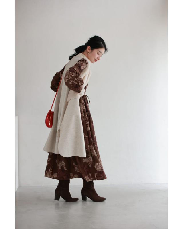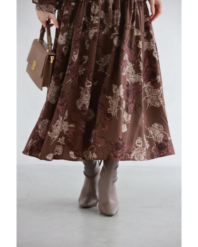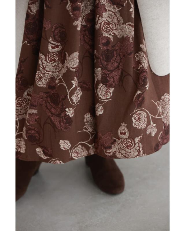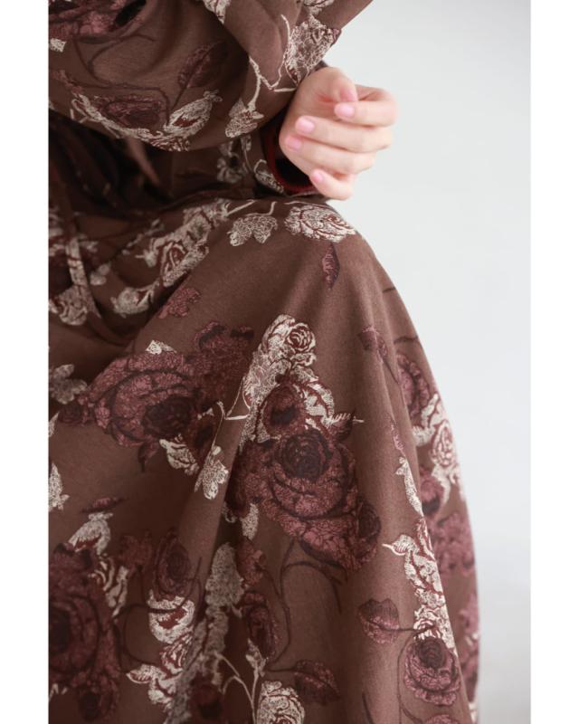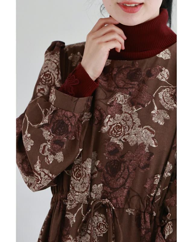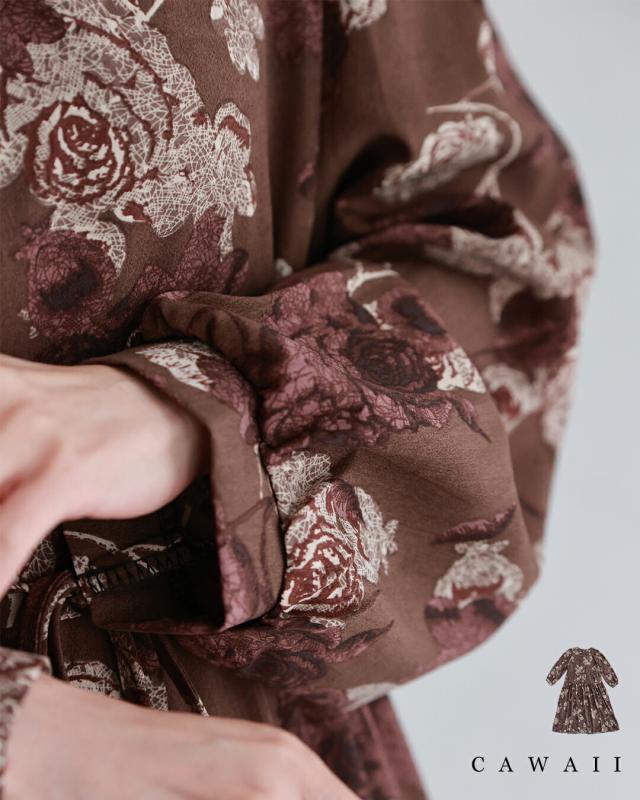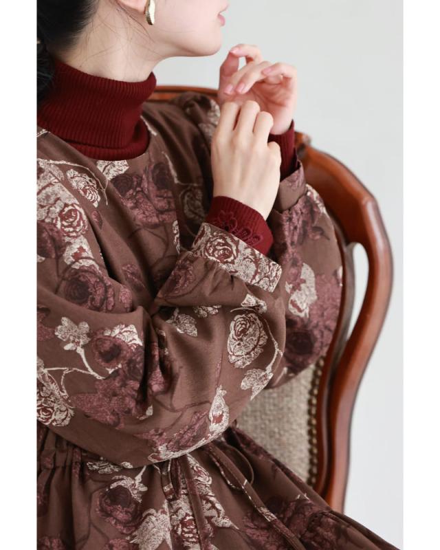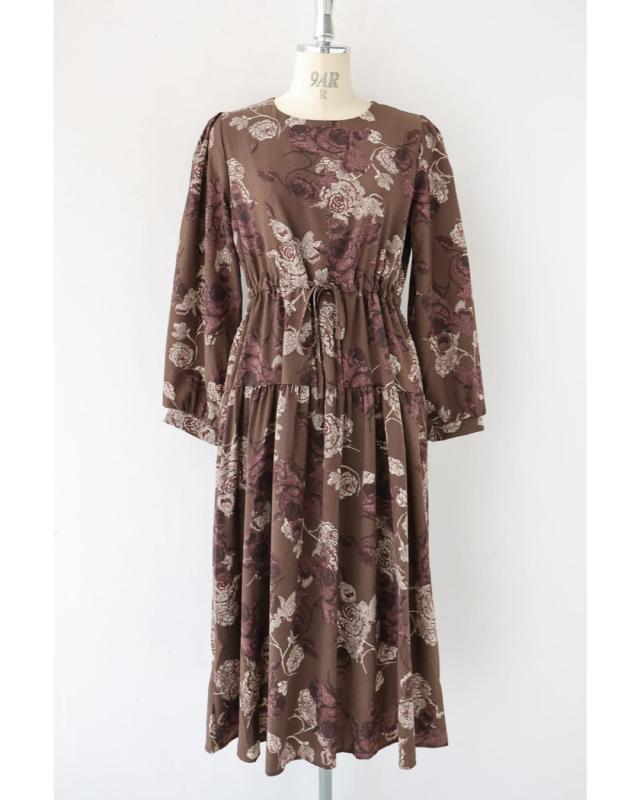 wkj00306 新作 新着 再入荷 CAWAII FRENCHPAVE フレンチパヴェ エレガント ベーシック カジュアル 可愛い かわいい カワイイ おしゃれ オシャレ お洒落 個性 個性的 定番 ベーシック 大人かわいい 大人可愛い 上品 女性らしい デザイン スタンダード ナチュラル きれいめ キレイめ シンプル フェミニン レディース レディースファッション 大人 ママ ミセス 30代 40代 50代 60代 優雅なバラ描く ショコラカラー ミディアム ワンピース 長袖 S M L XL ワンサイズ フリー 小さめ 小さい 低身長 痩せ ほっそり 小柄 細身 標準サイズ 大きめシルエット 大きい ビッグシルエット ゆったり F サイズ自由 春 秋 冬 秋服 秋物 冬服 冬物 体型カバー ブラウン 茶 柄 総柄 花 フラワー 普段着 日常使い デイリー おでかけ 旅行 デート 大人女子 プリント ティアード