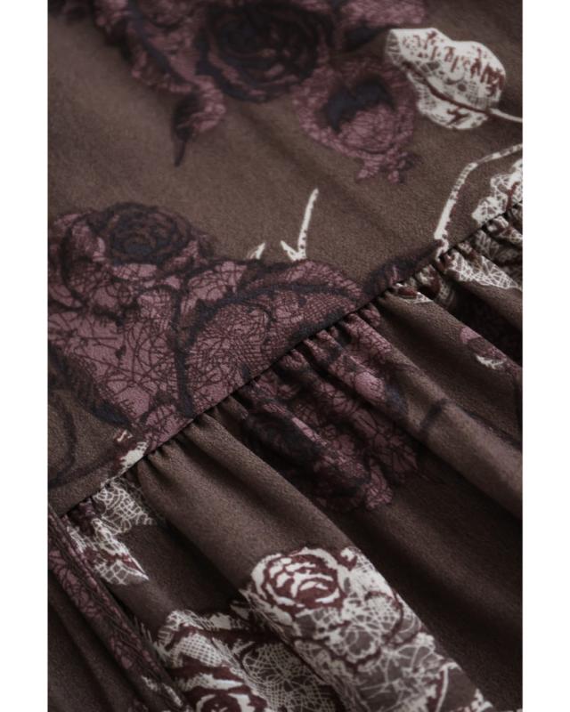 新作12月11日 優雅なバラ描くショコラカラーミディアムワンピース cawaii wkj00306 S~2L対応 大人女子 プリント ティアード 体型カバー ブラウン おしゃれ 柄 おでかけ 日常 レディース ファッション 大人 ママ ミセス 30代 40代 50代 60代