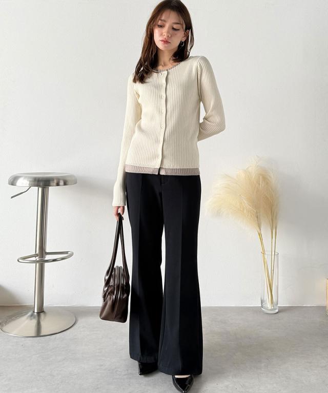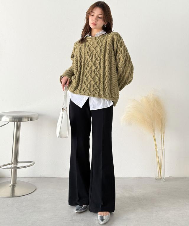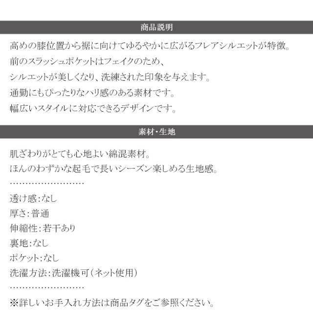 高めの膝位置から裾に向けてゆるやかに広がるフレアシルエットが特徴。