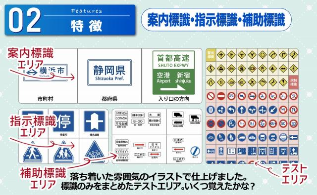 写真に近い高精細イラストで標識を再現しているため、実際の道路上での識別にも役立ちます。
