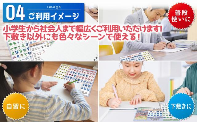 勉強机・教室・教習所・交通安全教室など、幅広い場面で学べる実用的な下敷きです。
