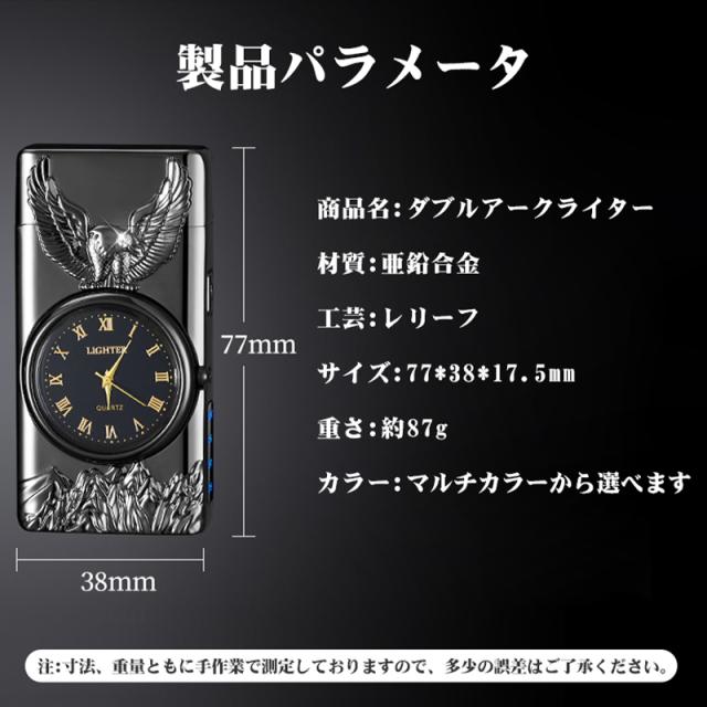 多機能ライター:LED照明搭載 時計付き 浮き彫りイーグルデザイン 充電式 卓上ライター